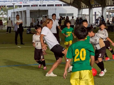 デフサッカーは、聴覚障がいのある選手が行うサッカーで、補聴器を外すことが義務付けられているため「音のないサッカー」とも呼ばれています。選手同士のコミュニケーションはアイコンタクトや手話で行われ、審判は笛の代わりにフラッグ(旗)を用いてプレーの停止などを伝達します。子ども達は、北澤氏やウンパルンパ氏、REGATE ドリブル塾と共に、デフサッカーを体験しました。北澤氏やデフサッカー日本代表選手のボール捌きに選手だけでなく保護者からも大きな歓声が上がりました。また、子どもたちから人気の高いウンパルンパ氏やREGATEドリブル塾との交流は、貴重な経験となりました。
