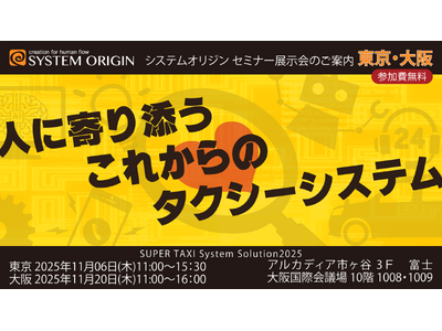 株式会社システムオリジン(本社:静岡県静岡市、代表取締役社長:海野知之)は、タクシー事業者様向けセミナー展示会「SUPER TAXI System Solution 2025」を、東京11月6日・大阪11月20日に開催致します。