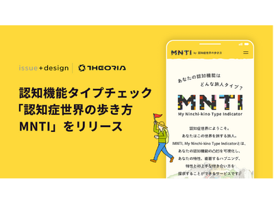 特定非営利活動法人イシュープラスデザイン(東京事務所:東京都文京区/代表:筧 裕介、以下issue+design)は、テオリア・テクノロジーズ株式会社(本社:東京都千代田区/代表取締役CEO:坂田 耕平、以下 テオリア)と協働し、自分の認知機能タイプをチェックできるWebサービス「認知症世界の歩き方 MNTI(My Ninchi-kino Type Indicator)(以下MNTI)」の提供を開始しました。