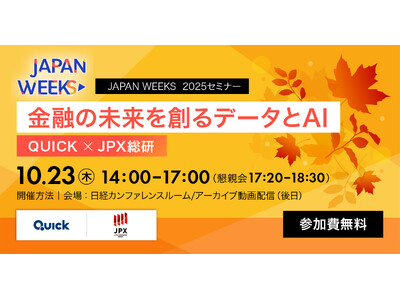 資産運用立国等の施策を国内外の金融機関や投資家等の関係者のニーズに沿って進め、国内投資に繋がる日本市場の魅力を効果的に発信するため、今年も「Japan Weeks」が開催されます。その関連イベントとして、日本の金融市場データの主要なプロバイダーである株式会社QUICK(以下「QUICK」)及び株式会社JPX総研(以下「JPX総研」)の共催で、「金融の未来を創るデータとAI」セミナーを開催する運びとなりました。