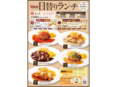 株式会社アークミール(本社:埼玉県さいたま市、代表取締役社長:柳 先)が運営するステーキハウス『フォルクス』では、9月25日(木)より平日(月~金)16時まで限定販売の日替りランチメニューを全5品中4品を新商品へ、1品は曜日変更した内容にてリニューアルいたします。