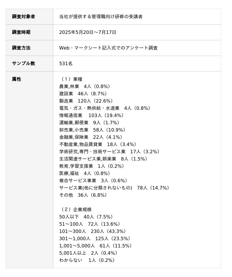 累計20,000社450万人以上の組織開発・人材育成を支援するALL DIFFERENT(オールディファレント)株式会社(所在地:東京都千代田区 代表取締役社長:眞崎大輔)および「人と組織の未来創り(R)」に関する調査・研究を行うラーニングイノベーション総合研究所(R)は、2025年5月20日~7月17日の期間で、管理職531名を対象に「管理職意識調査」を行いました。本リリースでは、回答者のうち課長クラス以上の管理職の役割や悩みに焦点を当てた結果を公表します。
