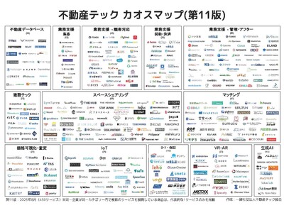 不動産テック協会の提供する不動産テックカオスマップは、不動産業界とテクノロジーを組み合わせたサービスや企業をカテゴリー別に分類し、全体像を一覧にしたものです。不動産業界における最新サービスを一望できる唯一の指標として、毎年多くの事業者やメディアに活用されています。