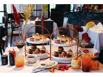 本アフタヌーンティーでは、定番のUSDAプライムビーフを使用したミニバーガーを、竹炭バンズで仕上げたハロウィン限定スタイルにアレンジ。さらに、雲丹とキャビアを添えたブリオッシュサンドにかぼちゃを取り入れるなど、見た目の華やかさとともに、味わいからも季節を感じていただけるセイボリーをご用意しております。