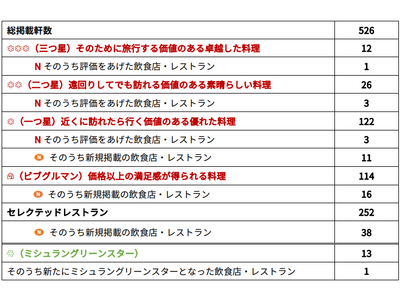- 東京は19年連続で世界で最も星付き掲載店が多い都市となりました。また、持続可能なガストロノミーに対し、積極的に活動しているレストランの象徴となるミシュラングリーンスターも世界で最も多い13軒でした。