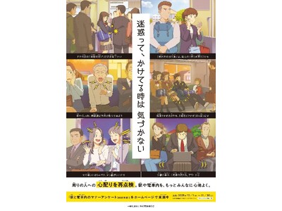 ・ポスター・デジタルサイネージでは、「駅と電車内のマナーアンケート」で上位に挙げられた行為を、6つの迷惑行為シーンとしてアニメ調のイラストで表現しています。各シーンには映画の字幕を思わせる簡潔な説明を添え、アニメ調の視覚表現と字幕風のキャプションの両方により、状況を直感的に理解できるようにしています。ポスターの中央には、「迷惑って、かけてる時は きづかない」という文言を掲出し、イラストを見た人が自らの行動を振り返り、鉄道利用時のマナーについて考えるきっかけとしています。下部には、「周りの人への、心配りを再点検」と記すことで、自身の行動を振り返り、他人を思いやる心づかいを促す構成としています。