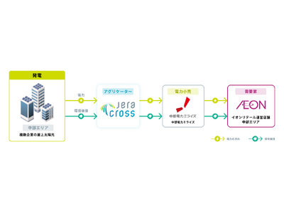 イオンとJERAグループは、イオンの脱炭素化に向けた取り組みとして、2025年8月1日から中部エリア※1において、JERA Crossが複数の屋根設置型太陽光発電の余剰電力をアグリゲーターとして束ね、中部電力ミライズ株式会社を通じて、イオンのグループ会社であるイオンリテール株式会社(以下、「イオンリテール」)が運営する店舗や事務所に供給しています。