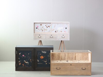 イベントや式典などで使用された花々に、乾燥や塗装などの加工を施し、アートピースとして再生。儚さと力強さが同居する独自の表現で、家具に生命力ある彩りを与えます。