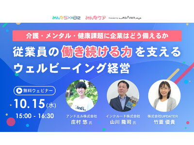 株式会社UPDATER(所在地:東京都世田谷区、代表取締役:大石英司)は、介護・メンタル・健康課題に備えるウェルビーイング経営をテーマとした無料オンラインウェビナーを、2025年10月15日(水)15:00~16:30に開催することを決定し、本日9月26日(金)より参加者を募集いたします。
