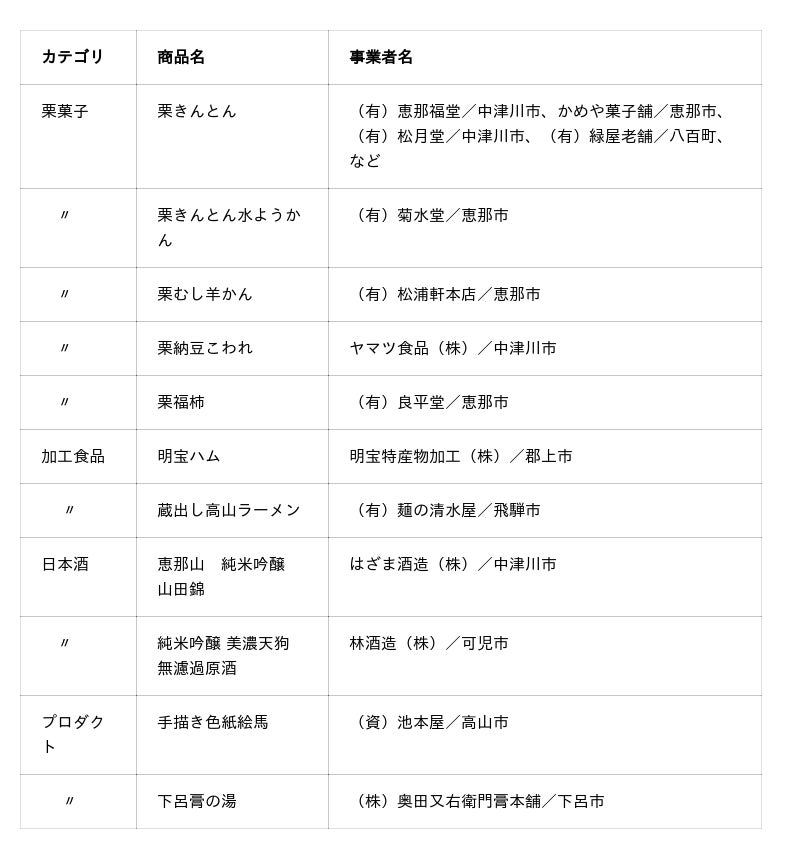 岐阜県は、飛騨山脈を源とする木曽三川(木曽川、長良川、揖斐川)をはじめとする豊かな清流と、濃尾平野や飛騨山脈の恩恵を受けた、味わい豊かな作物が育つ地です。秋ともなれば、柿、栗、りんご、米など、多くの作物が実りの時期を迎え、栗きんとんをはじめとする栗菓子など、旬の作物を使った名産品も数多くつくられます。今回のフェアでは、栗菓子を中心に、ブランドハム、高山ラーメン、日本酒、そして、伝統文化から生まれたプロダクトをご紹介します。