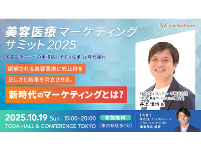 湘南美容クリニックをはじめ、国内外の医療機関に経営支援を行うSBCメディカルグループホールディングス(所在地:米国カリフォルニア州、CEO:相川 佳之、以下「SBC」)のマーケティング戦略を統括する最高マーケティング責任者(Chief Marketing Officer)井上 慎也(いのうえ しんや)が、クリニック向けオールインワンSaaS「medicalforce」を提供する株式会社メディカルフォース(所在地:東京都品川区、代表取締役CEO:畠中 翔一)が主催する「美容医療マーケティングサミット 2025」に登壇します。本サミットは2025年10月19日(日)にTODA HALL & CONFERENCE TOKYOにて開催されます。