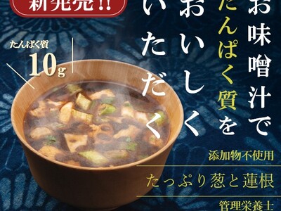 そこでグローバルヘルシーは、優れた栄養価で古くから人々の健康を支えてきた日本の伝統食品である味噌にフォーカスし、一杯で栄養をたっぷり補給できる「お味噌汁でたんぱく質をおいしくいただく[たっぷり葱と蓮根]」を開発しました。