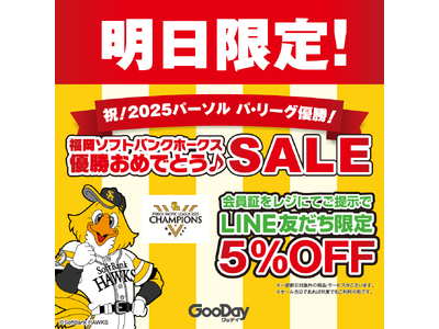 北部九州・山口にてホームセンターグッデイを運営する株式会社グッデイ(本社:福岡市中央区 代表:柳瀬隆志 ) は、福岡ソフトバンクホークスのリーグ優勝を記念して、『祝!2025パーソル パ・リーグ優勝!福岡ソフトバンクホークス 優勝おめでとう 』セール をグッデイ全65店舗にて9月28日(日)の1日限定で開催いたします。