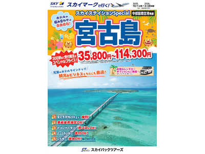 スカイパックツアーズ株式会社(本社:東京都中央区、社長:横山正巳)は、スカイマークを利用した価格固定型のパンフレット旅行商品「スカイステイションSpecial 宮古島」【中部国際空港発着】(2025年10月1日出発~2026年3月28日帰着)の販売を開始します。