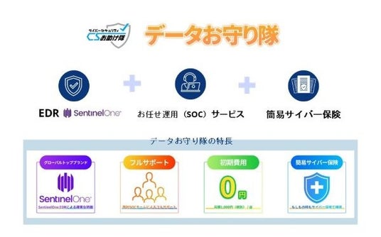 「テータお守り隊」は、独立行政法人情報処理推進機構(IPA)に認定されているEDR+SOC+簡易サイバー保険がセットになったセキュリティサービスです。PCなどの各端末に導入するだけで、AIが不審な挙動を自動で検知し、専門家が迅速に対応します。これにより、ランサムウェアをはじめとするサイバー攻撃の脅威からデータを守り、万が一の事態にも備えることができます。