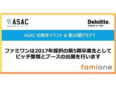10月15日にASAC10周年記念イベント並びに第20期採択企業のデモデイを開催予定となっており、第20期採択企業12社と共に過去の卒業生20社が登壇し、ブースとして36社のスタートアップが出展しています。ファミワンは第5期(2017年)の卒業生としてピッチ登壇とブース出展を行います。ご参加希望の方は、下記の『参加事前登録フォーム』にアクセスの上、予めご登録をお願い致します。