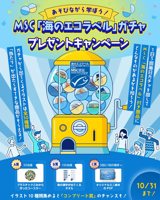 MSCの企画では、日本国内で身近なところで購入できるMSC「海のエコラベル」付き商品にどのようなものがあるかを知っていただけるよう、オンラインガチャを実施します。この、MSC「海のエコラベル」ガチャでは、ガチャを回すとMSCラベル付き商品のイラストが1種類出てきます。その際に当たりの表示が出たら、海や魚に関連したプレゼントをもらえます。1日3回までガチャを回すことができるので、毎日挑戦いただくことも可能です。さらに、商品のイラスト全10種類をすべて集めると、抽選で「コンプリート賞」が当たります。