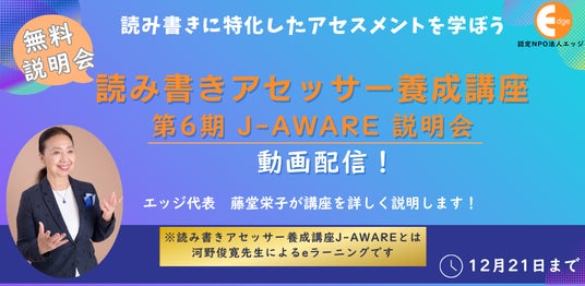 読み書きアセッサー養成講座・説明会動画 読み書きの困難さのアセスメント・支援方法が学べる講座の説明会動画を公開。視聴無料 申込〆切:12月21日(日)