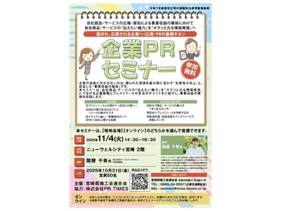 宮崎県商工会連合会は、中小企業・小規模事業者の広報力・情報発信力の向上を目的として、株式会社PR TIMESとタイアップし、広報・PRの基本が学べるセミナーを開催いたします。