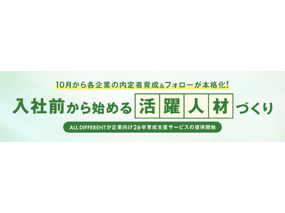 累計20,000社450万人以上の組織開発・人材育成を支援するALL DIFFERENT(オールディファレント)株式会社(所在地:東京都千代田区 代表取締役社長:眞崎大輔)は、10月1日より、2026年度入社予定の内定者を対象とした育成支援サービスの提供を開始します。学生から社会人へと大きな転換期を迎える内定者が、不安なく入社式を迎え、社会人として最高のスタートが切れるよう、内定者研修や学習アプリなどを通じて内定者の成長をサポートします。