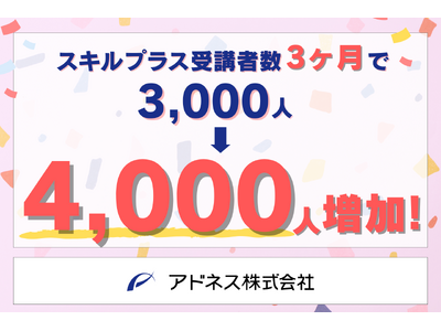 生成AIイノベーションのグローバルリーダー、アドネス株式会社(本社:東京都新宿区四谷、代表取締役社長:三上功太)は、マーケティングやSNS・広告運用、生成AI、セールス、デザインなど、実践的なスキルを効率よく習得できる社会人のためのスキル習得プログラム「スキルプラス」の累計受講者数が、2025年9月時点で4,000人を突破したことをお知らせいたします。