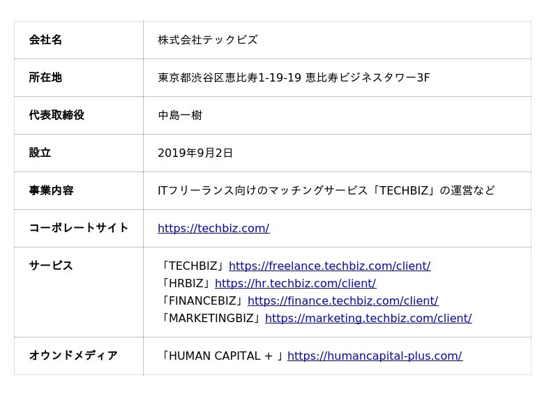 テックビズは「働き方を変え、世界を変えていく」をスローガンに掲げ、国内最大級のITフリーランス向けエージェント「TECHBIZ」を運営しています。近年ではマーケティング、人事、財務経理といったビジネス職のフリーランスと企業をマッチングするサービスにも事業領域を拡大しており、「アジア太平洋地域における急成長企業ランキング」にも2021年より3年連続でランクインしています。