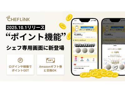 株式会社シェアダイン(本社:東京都港区、代表取締役:飯田陽狩)は、飲食事業者と料理人をつなぐ統合プラットフォーム「CHEFLINK(シェフリンク)」において、シェフ専用画面に“ポイント機能”を2025年10月1日よりリリースします。本機能によりシェフは、ログインやスポットワークでの稼働、学びや交流イベントへの参加など、日々の活動を通じてポイントを獲得し、そのポイントをキャリア形成に役立つ特典と交換できるようになります。