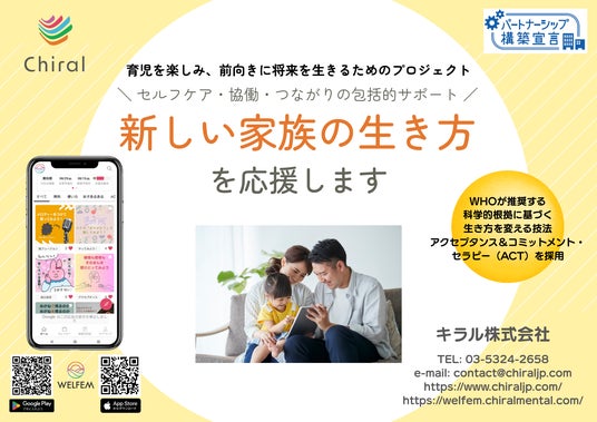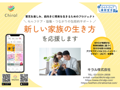そこでキラル株式会社では、周産期・育児期の「ストレス・孤独・コミュニケーション不全」に着目し、WHOが推奨し科学的根拠に基づく「アクセプタンス&コミットメント・セラピー(ACT)*」をベースとした「セルフケア」、本人だけでなくパートナーや家族と一緒に利用する「協働」、必要な制度や人ととの「つながり」を包括的にサポートする新しいアプローチのプログラムを開発予定です。
