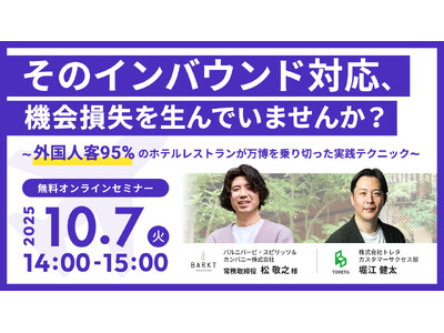 株式会社トレタ(本社:東京都渋谷区、代表取締役 CEO:中村 仁)は、2025年10月7日にオンラインにて「そのインバウンド対応、機会損失を生んでいませんか?~外国人客95%のホテルレストランが万博を乗り切った実践テクニック~」セミナーを開催いたします。ゲストにはバルニバービ・スピリッツ&カンパニー株式会社 常務取締役 松敬之氏を迎え、インバウンド客25%増・売上120万円アップを実現した多言語対応の実践術を初公開いたします。