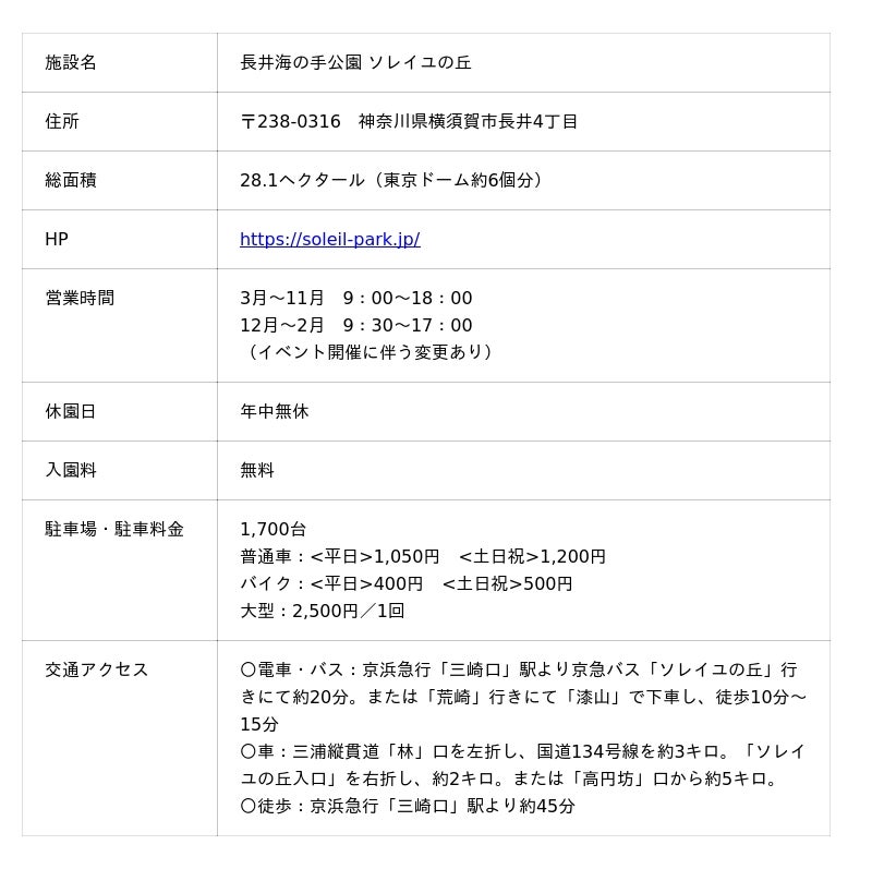 「365日誰もが遊び愉しみ尽くせるエンターテイメントパーク」として、2023年4月リニューアルオープン。都心から車で約70分の距離にありながら、1年を通じてさまざまな表情を見せる相模湾・伊豆大島・富士山などの絶景と園内に咲き誇る四季折々の花々、アスレチックやVRスポーツなど、世代や天候を問わず楽しめる公園です。さらに新設のイタリアンレストランはじめフードホール、ファストフード店など飲食施設も充実。