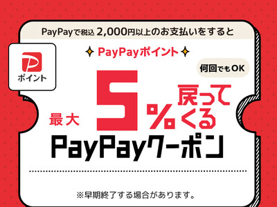 期間中、対象店舗でPayPay決済 2,000円(税込)以上で、後日最大5%相当のPayPayポイントが付与されます!
