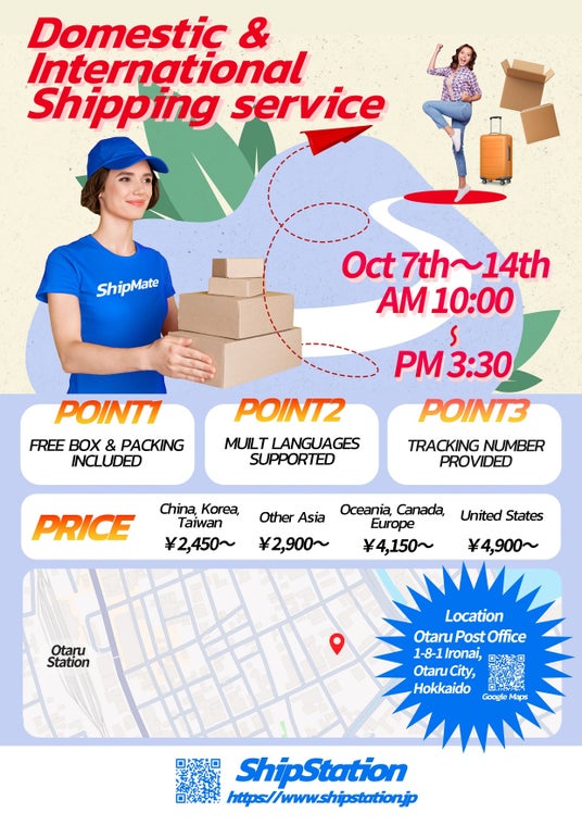 「国際発送をもっと身近に、よりシンプルに。」というミッションのもと、個人および訪日外国人がスムーズに国際発送を行える「ShipMate」および「ShipStation」を開発するShipMate株式会社(代表取締役:芦澤望、以下「ShipMate」)は、このたび小樽市(小樽郵便局)で訪日観光客に向けた国際発送サービスを開始いたします。