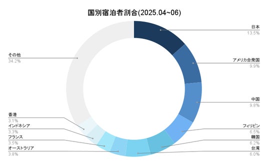 matsuri technologiesの運営する施設に宿泊したゲストの2025年4月~6月のレポートでは、宿泊したゲストの国別割合において、2025年1月~3月のレポートと比較して日本の割合が6.5%減少しました。同様に、韓国の割合も4.4%減少し、順位を下げています。