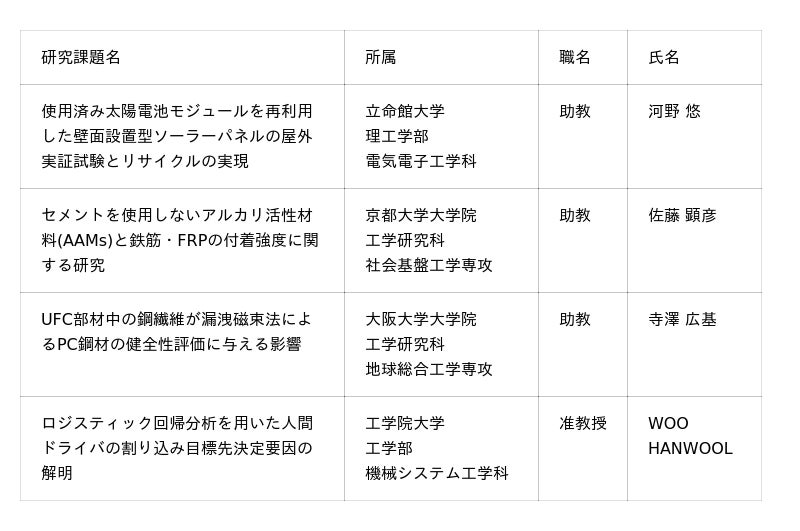 2025年度については、2025年5月9日から7月18日まで募集を行い、構造物、交通および情報科学などの幅広い分野から計13件の応募をいただきました。これらを社内選定委員会において厳正に審査した結果、次の4件の研究(計約600万円)に助成することを決定しました。