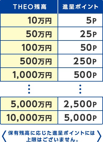 ・キャンペーン期間中(2025年10月~2026年2月)における各月末(判定日)においてTHEOを10万円以上運用中かつ、Vポイント進呈時までに出金もしくは解約が無いお客さま