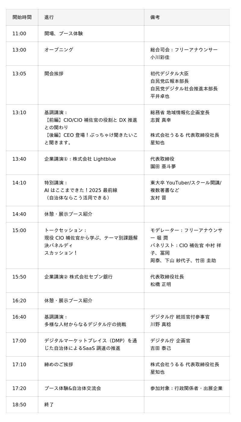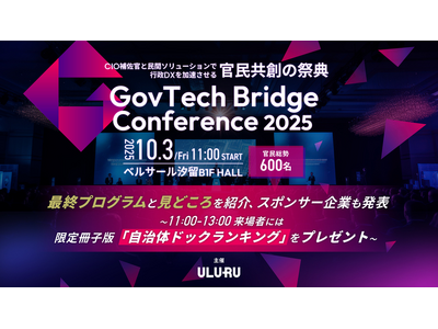 労働力不足問題解決のリーディングカンパニーとして、複数の SaaS を展開する株式会社うるる(東京都中央区 代表取締役社長:星 知也、以下「うるる」)は、2025 年 10 月 3 日(金)に東京・汐留で開催するうるる主催のイベント「GovTech Bridge Conference 2025 ~CIO 補佐官(※)と民間ソリューションで行政 DX を加速させる、官民共創の祭典~」について、最終プログラム内容およびスポンサー企業についてお知らせいたします。本カンファレンスには、現役 CIO や CIO 補佐官、DX 推進担当者、自治体 DXを支援する民間企業など官民総勢 600 名超が集結予定です。なお、一般参加の受付はすでに終了しております。