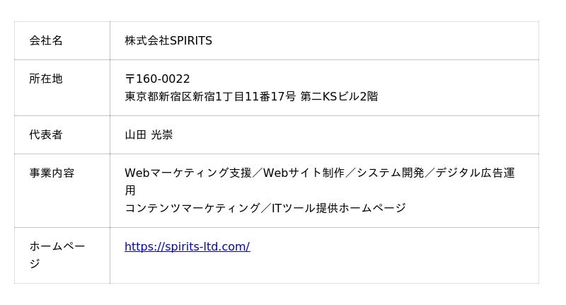 株式会社SPIRITS(スピリッツ)は、Webマーケティングでのビジネス成果をサポートする東京のWebマーケティング会社です。Web制作・ホームページ制作・システム開発・デジタル広告運用・コンテンツマーケティングなどを通して、御社のWebマーケティングを一貫してサポートします。