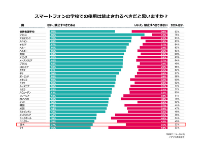 日本全体で「学校でのスマートフォンの使用を禁止すべき」と答えた人は37%にとどまり、30カ国中29位でした。