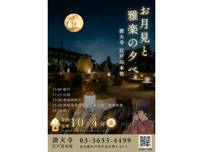 宗教法人 證大寺(東京都江戸川区、二十世住職:井上 城治)は、10月4日(土)に「證大寺 江戸川本坊」(東京都江戸川区)、「證大寺 船橋昭和浄苑」(千葉県船橋市)、「證大寺 森林公園昭和浄苑」(埼玉県東松山市)で『お月見と雅楽の夕べ』を開催いたします。