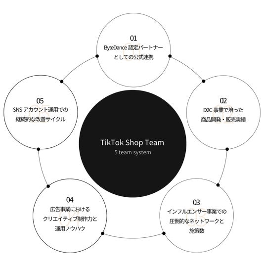 ナハトは、ショップ開設から運営、インフルエンサーマーケティング、広告運用、アカウント運用、すべての体制が整っています。この体制により、TikTokShopおよび、広告・SNS・インフルエンサー領域において実績を出してきました。