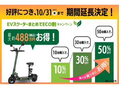 株式会社ブレイズ(愛知県名古屋市、代表取締役:市川秀幸、以下ブレイズ)は、2025年9月1日(月)より実施している「EVスクーターまとめてECO割キャンペーン」がご好評をいただいていることを受け、実施期間を10/31(金)まで延長することを決定いたしました。