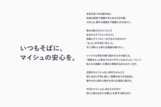 シンボルマークに採用した「グリフォン」は、鷲の知恵と獅子の力強さを兼ね備え、あらゆる困難に立ち向かい、お客さまの刻々と変わる日々の暮らしを見守り続けたいという、Mysuranceの想いを重ねています。