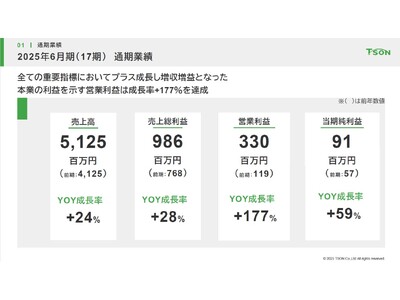 2025年6月期通期の業績は、売上高は5,125百万円(前年比24%増)、売上総利益は986百万円(前年比28%増)、営業利益は330百万円(前年比177%増)、純利益は91百万円(前年比59%増)となりました。