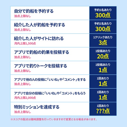 - アングラーズ釣船予約からの予約:1名につき300点(10人で予約すると3,000点獲得)※予約送信日から90日以内の乗船日の予約に限定します。