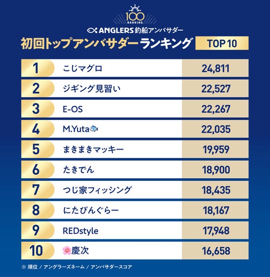 本企画には、開始以来すでに総勢5,000名以上もの釣り人がエントリー。多くの釣り人から熱意あふれる参加をいただき、大きな盛り上がりを見せています。その中からアンバサダースコア上位100名が確定。今回選ばれた100名のうち、注目のTOP10を発表します。