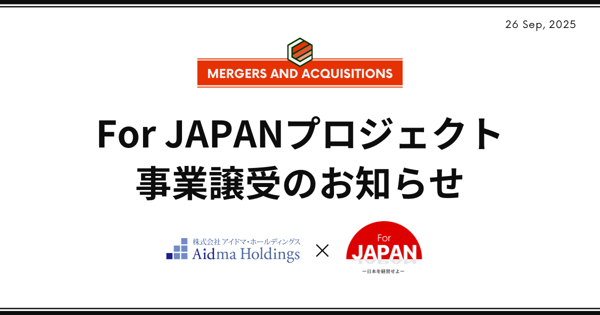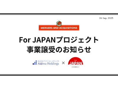人の力とテクノロジーで再現性のある経営ソリューションを提供する株式会社アイドマ・ホールディングス(本社:東京都品川区、代表取締役:三浦 陽平、以下:アイドマHD)は、絆ホールディングス株式会社(本社:東京都新宿区、代表取締役:伊藤 宜範、以下:絆HD)が行う「For JAPANプロジェクト」を 2025年9月26日(金)付で事業譲受したことをお知らせします。