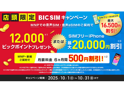 ビックカメラグループが提供する「BIC SIM powered by IIJ(以下、BIC SIM)」は、ビックカメラグループ店舗限定で、新型iPhone 17シリーズを含むSIMフリーiPhoneを最大20,000円割引、人気の最新Android端末も最大16,500円割引、またはBIC SIMの月々のお支払いにも利用できるビックポイントを12,000ポイントプレゼントします。
