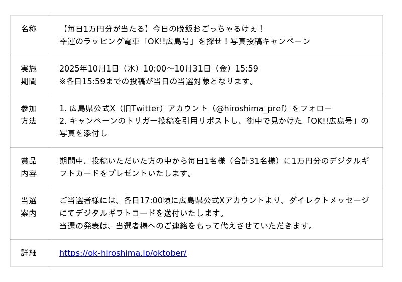 幸運のラッピング電車「OK!!広島号」を探せ!写真投稿キャンペーン2025年10月1日(水)~31日(金)の期間中、「OK!!広島号」の写真をSNSに投稿いただいた方の中から、毎日1名様に1万円分のデジタルギフトカードをプレゼントする、写真投稿キャンペーンを実施いたします。