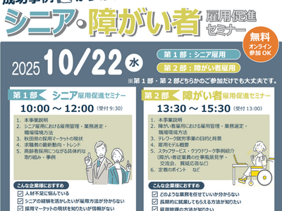 本事業のイベントは10月下旬から順次開催します。10月22日(水)には秋田県内の企業に向けて「雇用促進 セミナー」を開催します。障がい特性やこれまでの経験に応じた仕事選定や職場環境の整備などのノウハウを学ぶほ か、シニアが職場で活躍する好事例を紹介します。県内の多くの企業に情報を届けるため、参加方法は会場、オン ライン、各地ハローワークでのパブリックビューイングを用意しており、後日のアーカイブ配信も実施します。