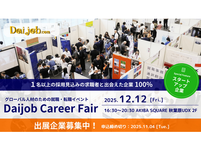- 英語などの語学力を活かして働きたいグローバル人材のための対面型転職イベント「第58回Daijob Career Fair」(2025年12月12日(金)AKIBA_SQUARE[東京都:秋葉原]で開催)へ出展する企業を募集